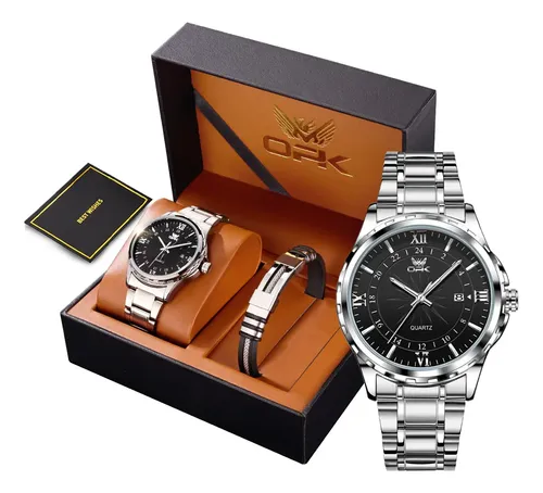 Conjunto de Relógio e Pulseira Masculino Luxo Prateado Preto